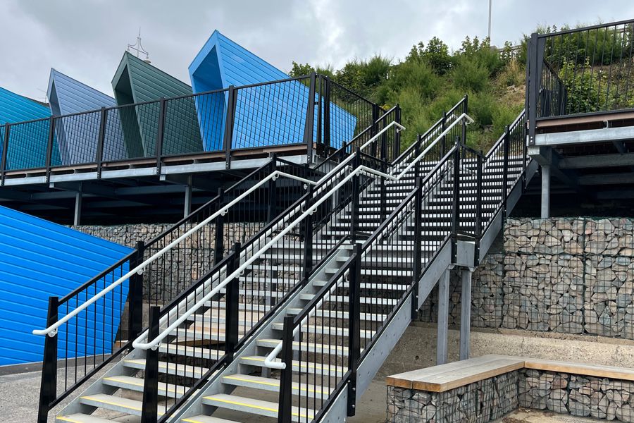 A non-slip composite deck board, featuring integrated floor lighting, was then laid. The 72 timber beach huts were delivered flat pack to site and constructed over two tiers (with the lower tier designed for accessibility). Access stairs with metal balustrades and handrails were installed to ensure safe and easy access.